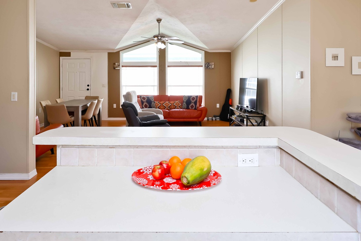 With its charming screened-in half porch, covered carport with side-by-side parking for two cars, and mature tropical landscaping featuring palms and flowering shrubs, “Mahogany Manor” offers wonderful curb appeal and an exceptional opportunity at under $65,000. This three-bedroom, two-bath home features a bright open floor plan where the living room, dining area, and kitchen flow comfortably together under dramatic vaulted ceilings. Large windows with fanlights above invite natural light into the main living space, highlighting the gorgeous honey colored hardwood laminate flooring throughout the common areas. The kitchen provides generous cabinet storage, black and stainless steel appliances (range, dishwasher, and refrigerator), and a functional two-tiered island that separates the kitchen from the living and dining areas — perfect for casual dining or entertaining. Just beyond the kitchen is a built-in desk nook ideal for a home office or hobby space. A separate utility room includes a full-sized washer and dryer, both included in the sale, adding convenience and immediate move-in functionality. All three bedrooms are comfortably sized with newer plank vinyl tile in a hardwood look. The primary suite features a walk-in closet and an ensuite bath with a walk-in shower and a Roman soaking tub. Hurricane shutters throughout the home are included, offering added storm protection and peace of mind. This estate sale is priced to reflect cosmetic updates a new owner may wish to make. Some cabinetry and laminate countertops show wear, and the roof is older and will likely require replacement in the coming years. As such, this is a cash-only purchase, and buyers will need to obtain the community insurance waiver (approximately $5,400) in lieu of conforming insurance. With two-car side-by-side parking, a screened porch for relaxing evenings, included washer and dryer, hurricane shutters, and strong underlying value at this price point, this home presents an excellent opportunity for buyers looking to personalize a well-located property within a desirable lakeside community. Finally, like all homes in this lovely lakeside community, you will enjoy central air and heat, off-street covered parking, your own outdoor storage shed, lovely landscaping, and access to the community's extensive recreational amenities including fitness, tennis, basketball, clubhouse, sauna, heated pool complex, lake recreation and more.